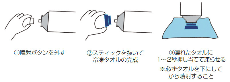 2.無数の噴射穴がある専用スティック内に-20℃の冷却剤を注入することによって、巻かれた濡れタオルに含まれた水分を瞬時に凍らせることができる。