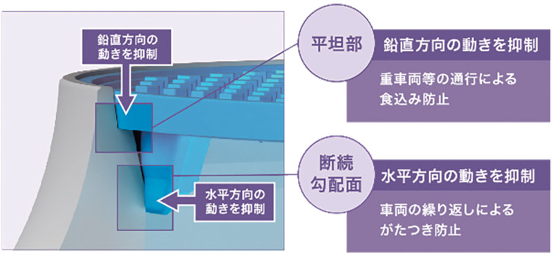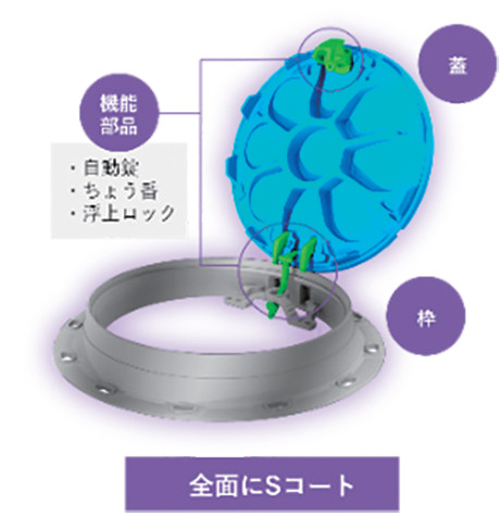 次世代型高品位グラウンドマンホールSVは、蓋と枠の支持部を「断続勾配面」と「平坦部」で構成することで、枠に対する蓋の動きを最小化できる新しい支持構造であり、かつ蓋、枠および機能部品の全面に高い耐久性を有する防食表面処理を施した構造を特長とする。