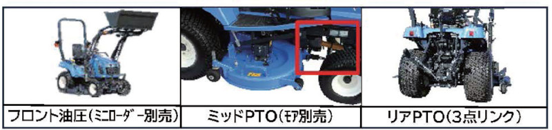 ミッドPTOにはモーアを取り付けることで芝・草刈作業が可能。