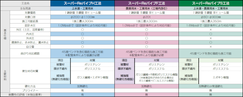 また、本工法では「H工法」「F工法」「S工法」の3種類から用途に応じて選択でき、水質や耐震性の確保も可能である。