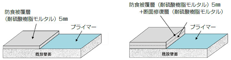 速硬化性の有機系耐硫酸樹脂モルタルを用いて、防食被覆層を形成するモルタルライニング工法があり、断面修復用モルタルとして同一材料を用いることで、施工時間の短縮を図ることができる技術である。