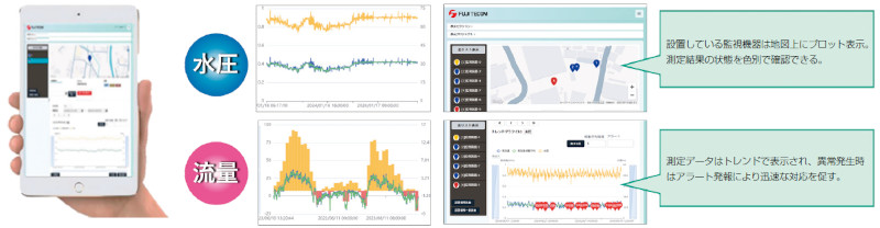 消火栓や減圧弁、中間流量監視ポイントなど水道管路施設に設置し記録した水圧・流量などの実測データをクラウドに送信。