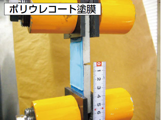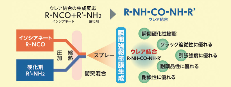 ポリウレア樹脂によって形成される塗膜は、平均厚2㎜の高密度塗膜で、非常に高い耐久性・安全性を有し、施工性にも優れている。