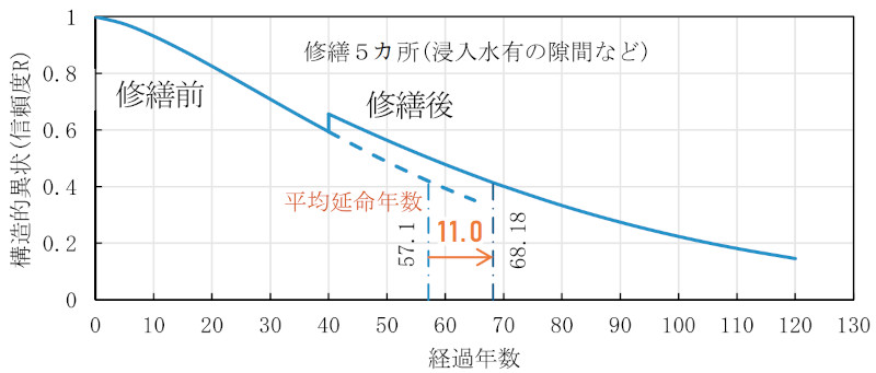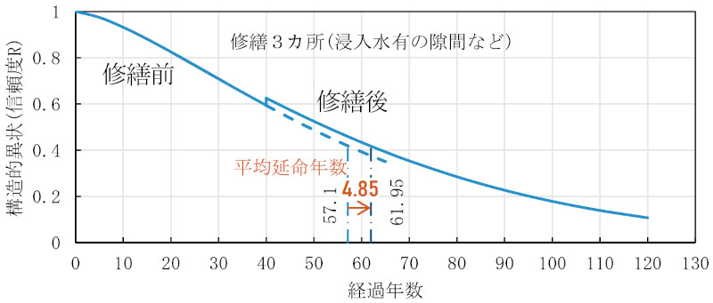 10カ所の異状のうち、管理的異状である浸入水の原因となる隙間、クラックの3カ所を修繕した場合の信頼度曲線は図-1の通りである。