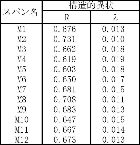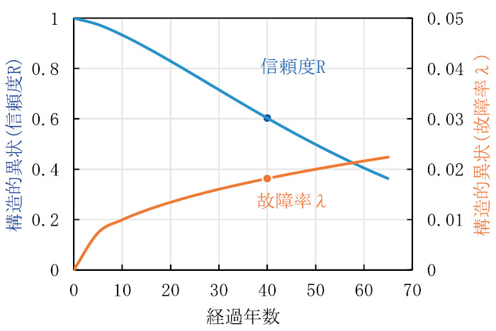 スパンごとの経過年数40年の信頼度(R)と故障率(λ)を表-2に示す。