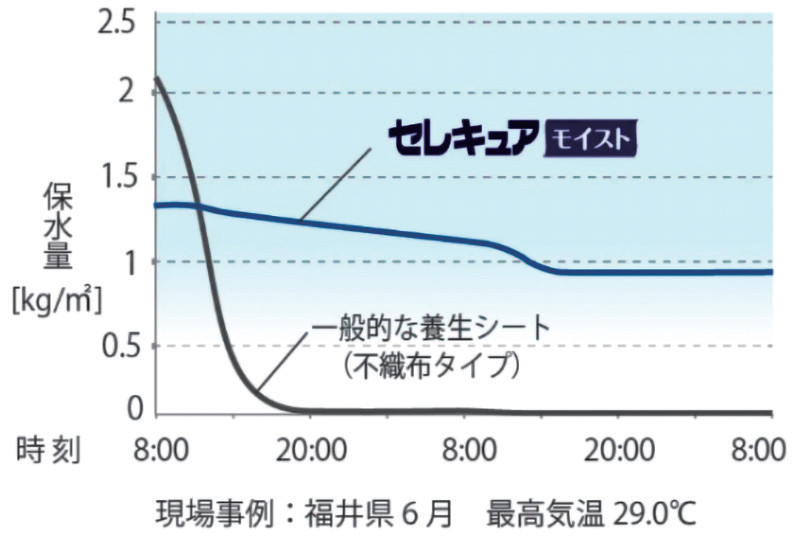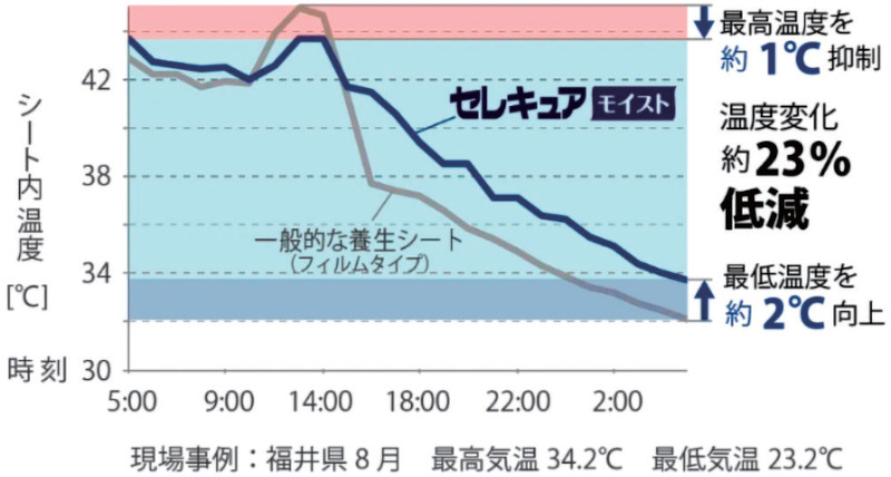 本製品は、新開発のサーモフィルムと機能素材を積層することで、遮熱と水分保持を実現しており、養生環境をより安定させ、付帯作業の軽減を可能にしている。