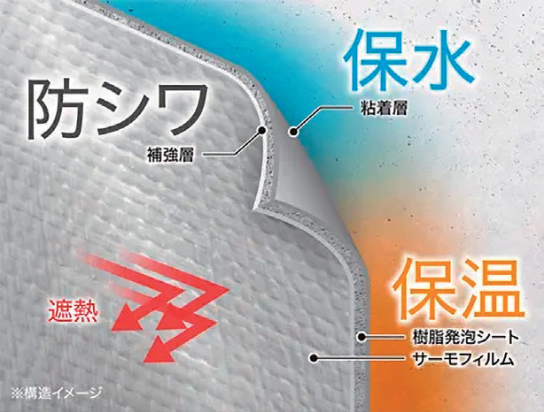 粘着層の密着機能により保水性を実現するとともに、独自技術による遮熱・断熱機能で保温性能も確保している。