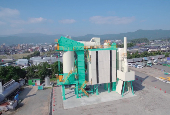 本設備は中温化合材製造に対応し、非化石燃料混焼システムを標準装備した新型アスファルトプラントであり、UCO(廃食油)供給サービスとの併用により、二酸化炭素と硫黄酸化物の排出量を大幅に削減し、環境負荷の低減を実現する。