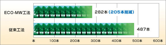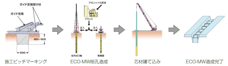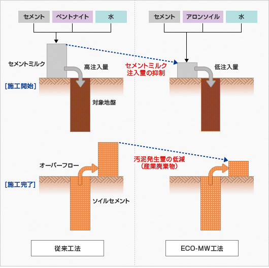 「ECO-MW工法」とは、従来の連続地中壁のうち、柱列式連続壁、等厚式連続壁などの原位置攪拌ソイルセメント連続壁工事において、セメントミルクの注入量を低減することにより産業廃棄物である泥土発生量を大幅に低減する工法である。