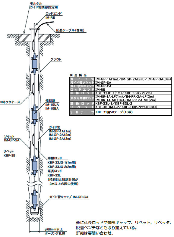 あらかじめ専用ガイド管を地盤や構造物に鉛直に設置、測定深度に応じて複数の傾斜計を、中継ロッドを介して多段接続し、ガイド管に挿入する。