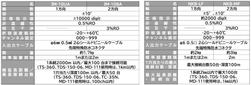 「IM-10UA、NKB-LFは1方向のみ、IM-10BA、NKB-MF、は1台でXとYの2方向が同時に測定」できる。