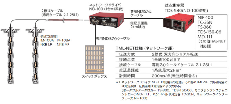 傾斜計はネットワークモジュール内蔵で、各傾斜計は 「デジタル通信と電源供給を行う1本のケーブルで順次接続」する。