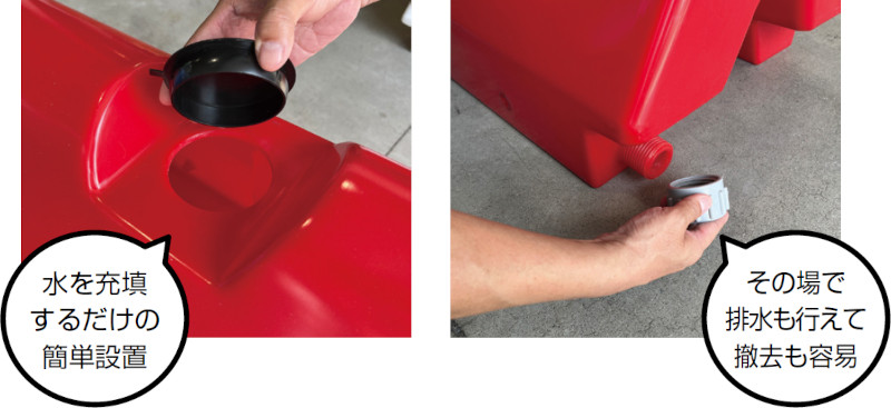 注水口から直接水を充填するだけで設置が完了し、撤去時には排水口からその場で排水できるため、容易に撤去・移動が可能である。