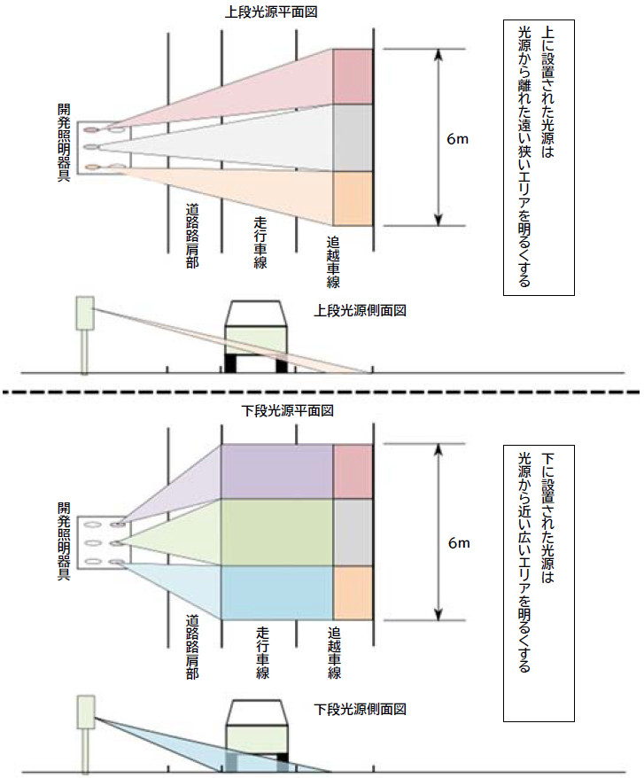 加えて、複数光源による照射制御により、まぶしさを軽減しつつ道路面の均一照度を確保でき、エネルギー効率の向上および視線誘導効果の向上が図れる。