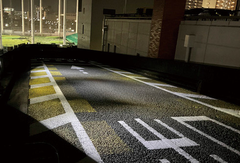 従来の高所設置型照明に比べ、不要なエリアへの漏れ光を抑制し、必要な範囲のみを効率的に照射できる。