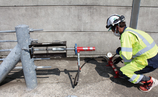 ・油圧引きシリンダーを使用したガードケーブル緊張機。