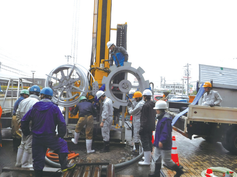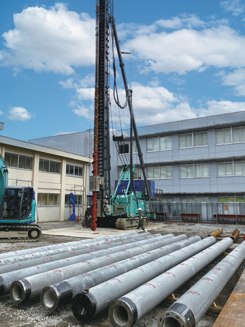 「HI-BEX E+工法」は、既製コンクリート杭を熱採熱器として利用する埋め込み杭工法である。
