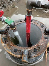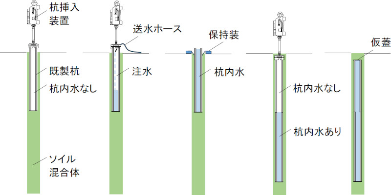挿入した杭の浮力を相殺するために送水ホースや杭挿入装置を用いて杭中空部に清水などを注入し杭を安定させる。