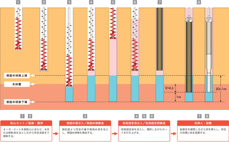 また、地盤の掘削形状や根固め液などの各種溶液の仕様は、既評定工法であるHI-BEX工法と同じであり、HI-BEX工法と同様の鉛直支持力を有するものである。