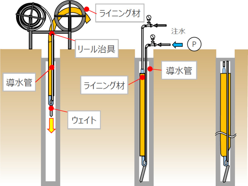 既製コンクリート杭を熱交換器とするには、既製コンクリート杭の先端を閉塞とし、杭中空部を液体媒体で満たす他、中空部に樹脂製採熱管(WUチューブまたは管更正技術を応用したライニング袋)などを設置する方法がある。
