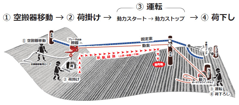 シンプル架線(ポータブルウインチなどの動力1つとブレーキ付き搬器で構成される)に対応。