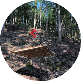 重機・ドローンが入れない斜面・谷での運搬作業で活躍。
