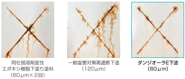 従来品と比較して架橋密度を高めることで、腐食因子が透過しにくい緻密な塗膜構造を形成し、水分や塩分等の透過を抑制する。