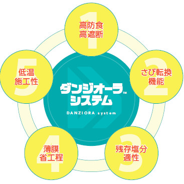 本製品は、高遮断性塗膜による長期防食性、さび面への適用性、ならびに低温乾燥性(施工下限温度-5℃)を有しており、素地調整作業の簡易化、施工条件の緩和、防食品質の安定化を図ることが可能となる。