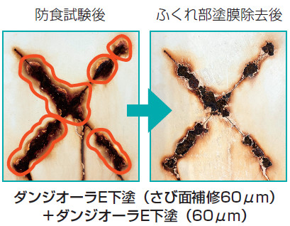 さらに、塗膜中に侵入した水蒸気により特殊顔料が溶出して樹脂と反応し、塗膜構造が時間の経過とともに 緻密化することで塗膜抵抗値が向上し、長期間にわたる防食性能の維持が可能となる。