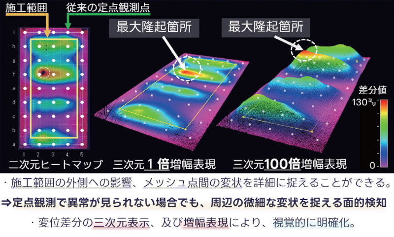 これにより、点的観測では見落とされがちな局所的変状の検出が可能となる。