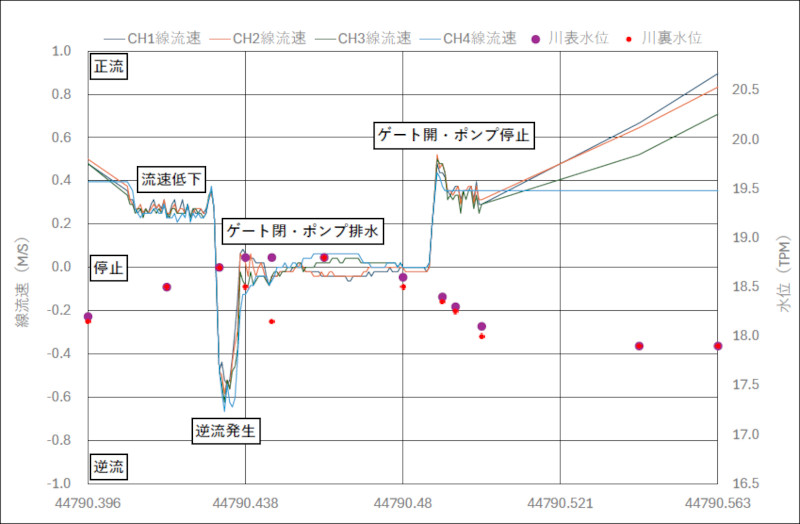 本川の水位が低下したことを確認し、ゲートを開操作して自然排水に切り替え、グラフ上でも正流に戻ったことを計測した。