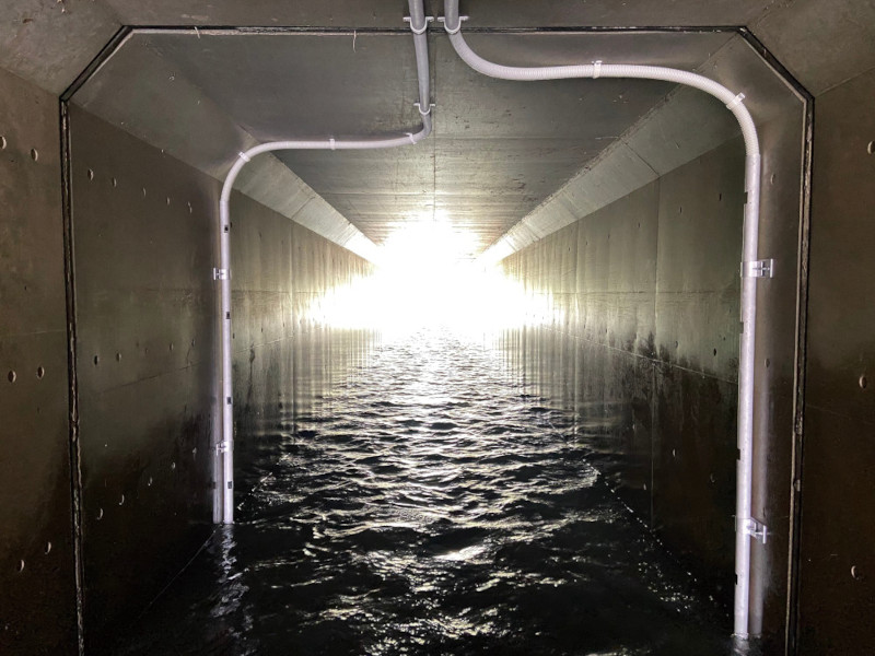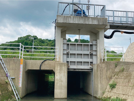 豪雨時は、排水先の本川水位(外水位)が高くなることで流れにくさや逆流が発生する可能性があるが、従来の目視による内外水位差や表面流速の観測は、逆流の判断が困難であった。