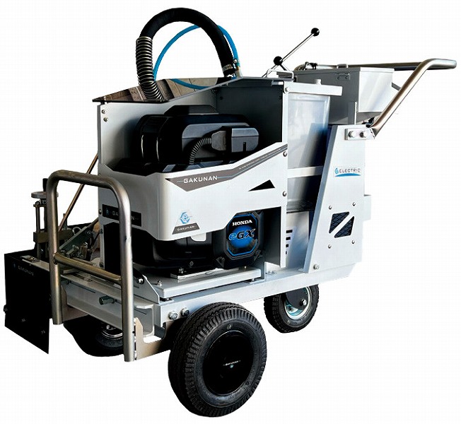 本製品は電動パワーユニットを搭載した自走式センターライン施工機である。 走行時に排気ガスを発生させない構造と静音性に配慮した設計により、住宅地や夜間作業など周辺環境への影響を考慮した施工に適している。 また、HST(油圧式無段変速ユニット)を搭載し、スムーズな走行と安定した施工を可能としている。