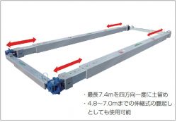 大口径長尺管を埋設する開削工事で使用する簡易土留。土留材をユニット化し、かつ切梁スイング機構が付いているのが特長であり、従来のように鋼製山留材を使用する必要がなく、工程の短縮および経済性の向上を実現する。
