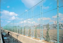 柱にコラムを使用し、下胴部に金網ハズレ防止のためネットホルダーを取り付けている。P型基礎コンクリート使用のオーガー掘削工法により、工事費、工期を飛躍的に縮小。下胴縁に金網ハズレ防止のための「ネットホルダー」を取付け。