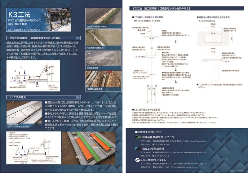 K3工法は、橋梁上部工における鋼製排水溝設置工の鋼製排水溝を受けるモルタル敷設工法に関する技術である。正練り敷モルタルの水密性および鋼製排水溝との密着性および、正練り敷モルタルの遮水効果により空練り敷モルタル浸食が原因の滞水および漏水の予防が期待できる工法である。モルタル敷設に正練り敷モルタルを適用することで、従来の空練り敷モルタルに比べモルタルの水密性が高くなるため、モルタル内に水分が滞留せず、モルタル下の床版への漏水を防止できるものである。また、正練り敷モルタル敷設の周囲には繊維補強セメント板のK3ボードを配置するため、モルタル打ち込み時のモルタル形状が保持される。K3ボードはモルタルと同材質の埋設型枠であるため、撤去する必要がない部材である。