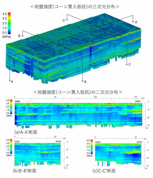 「GEO-DIVER」はPVD工に関する技術である。本技術はPVD施工時の油圧抵抗からコーン貫入抵抗qcを推定し、PVD打設位置情報と連動させることで、地盤の強度分布や地質分布を多次元的に図化処理するシステムである。