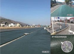 「強草目地シート」は、舗装とブロックの目地からの強壮雑草の発生を未然に抑止する技術で、従来は雑草が繁茂してから行う除草作業で対応していた。強草目地シートの活用により、継続した除草工は不要となり、視界確保による安全性向上、雑草処分量削減による環境への負荷の軽減が図れる。