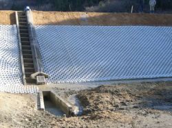 植生基盤材(客土袋4号・40ℓ)を保持するための金網製コンテナ。のり面に植生基盤となる客土袋をリブネットとアンカーピンで固定し、吹付工法でプランター状に成形し、ツル植物等を植栽し、のり面を緑化する。