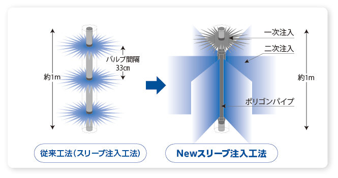 「Newスリーブ注入工法」は、外形を六角柱状にした注入パイプ「ポリゴンパイプ」を使用することで、縦方向の長い注入区間の形成が可能な薬液注入工法。これにより複雑な地盤を確実にとらえ、高品質な改良地盤を形成できる。従来工法より高速注入、広い注入孔間隔でも施工でき、低コスト化と工期短縮が図れる。