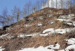 [主な特長]1)主柱をコンクリート基礎で固定する堅固な構造、2)等高線の揃った均一斜面(人工法面)に適する、3)主に積雪深が3.0m以下の斜面に設置が望ましい、4)冬期以外は落石防護柵として機能を有する。