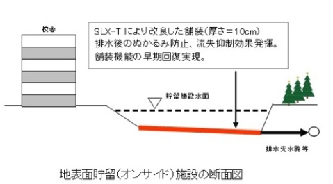 「SLX-T工法」は、高耐水性を持つ土系舗装である。通常は、校庭・公園・多目的広場等として使用し、雨天時には雨水貯留施設として使用できる。排水後、通常使用できるまで時間が極めて短く、約2~3時間である。多くの場合、砕石層・暗渠管排水施設の施工が不要であり、工事金額を無理なく節減できる。国からの補助金を活用した施工ができ、施工後の会計検査にも合格している工法である。環境と防災を両立させる画期的な工法として、注目を集めている。