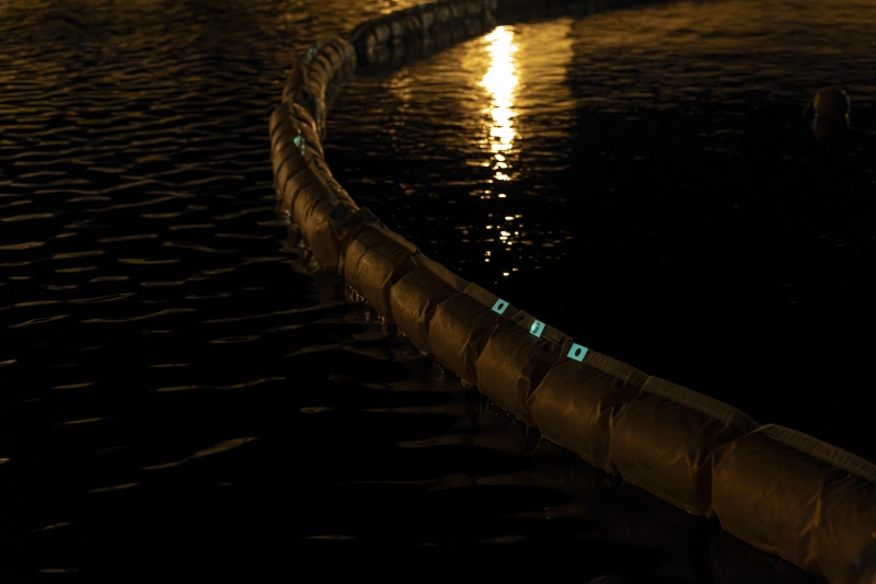 「アルファ・グリーンアイ」は、夜間に海上の汚濁防止膜設置展開区域を連続的に自発光させ、暗所での目印として視認性を高めた超高輝度蓄光汚濁防止膜で、従来は発光材・反射材等が付いていない汚濁防止膜で対応していた。アルファ・グリーンアイの活用により、安全性の向上が期待できる。