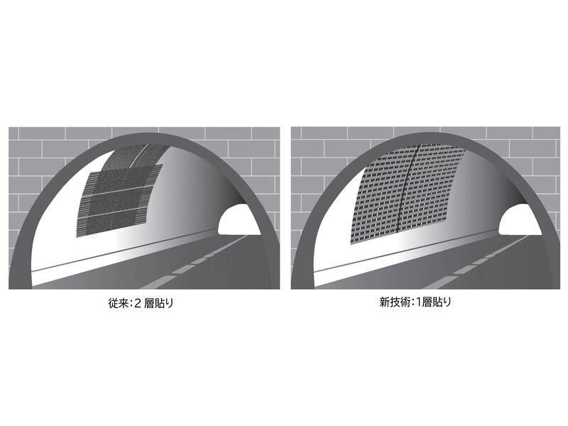 「FFシートCR240」は、内面補強工に用いる1層貼りが可能な2方向炭素繊維シートで、従来は1方向炭素繊維シートの2層貼りで対応していた。FFシートCR240の活用により、2層貼りから1層貼りへ縮減でき、省力化となるため、経済性、施工性、品質の向上、工程の短縮が図られる。