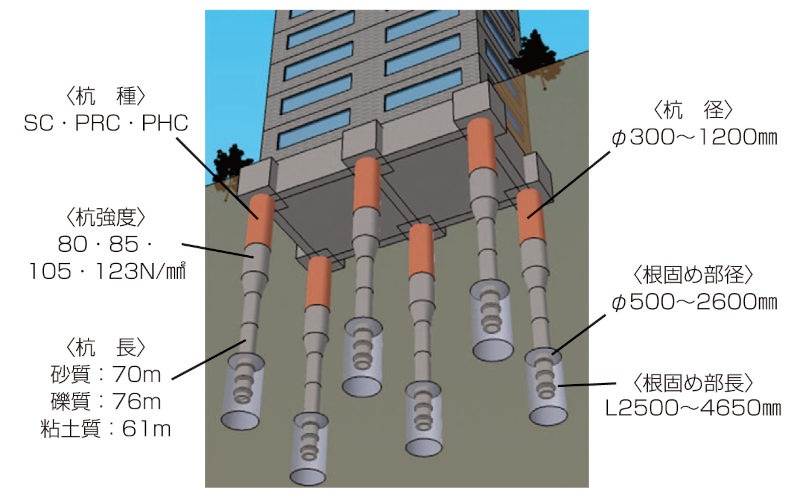 Hybridニーディング工法は、従来工法と比較して支持力および施工管理を強化した高支持力工法である。これにより、従来以上に柔軟な設計が可能となるほか、施工面では新たな品質管理手法を導入することで、コストパフォーマンスに優れ、環境にも配慮した基礎杭の提供を実現する。
