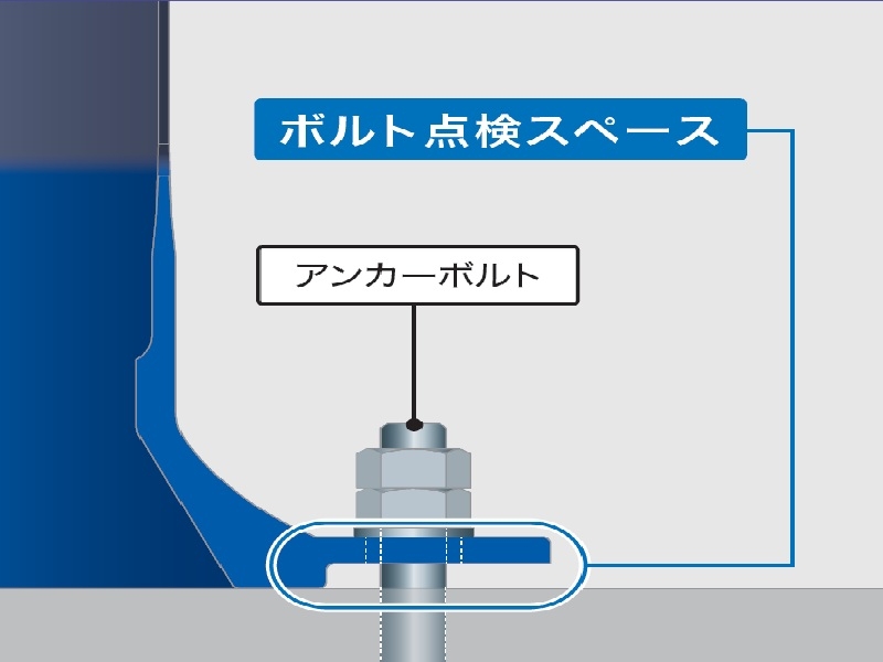 本技術は、露出型ポール製品の柱脚部にあらかじめアンカーボルトの腐食点検用スペースを設け点検作業を容易にする技術である。本技術の活用により、従来、目視点検できなかった箇所を確認できるようになる。