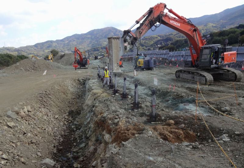 本技術は大規模オープン掘削時、大容量破砕を実現させるため、本割岩装置(Wボルト仕様)とショートロット内蔵のかち割り君を融合させた技術である。防音型クローラドリルで削孔(φ152mm,H=3.25m)を行い、本割岩装置(Wボルト仕様)L=3.9m,10本を1組として孔に建込み、ショートロット内蔵のかち割り君で本割岩装置を数回軽く均等に打撃し、楔の原理および各孔間の亀裂による相乗効果で「24,054t」の破砕力を発揮し 硬岩IIまで対応できるダイナミックな大容量低公害岩盤掘削工法である。