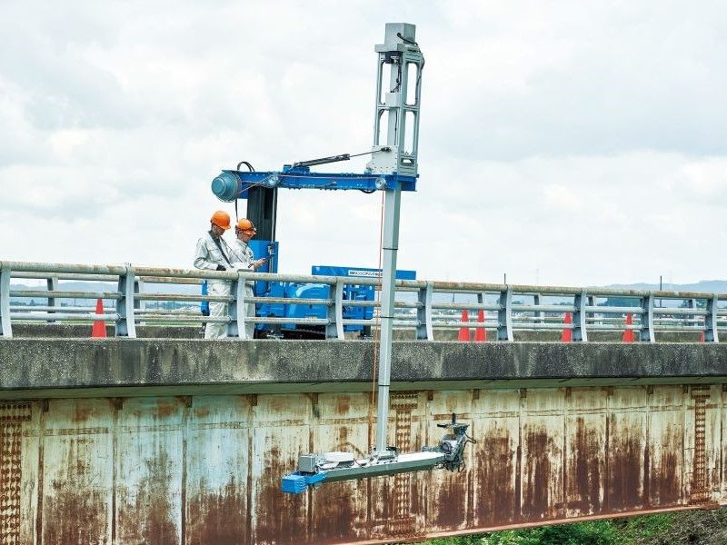 「橋梁点検ロボット」は、橋梁の桁下部を撮影機器で目視点検するロボットであり、従来は橋梁点検車で対応していた。本技術の活用により人による近接目視点検を代替でき、省人化、安全性の向上、周辺環境への影響抑制を期待できる。