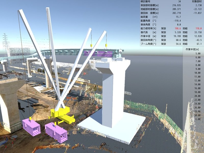 「CLOVER.SIM」は、橋梁の架設計画において、3Dモデルや点群データを利用してクレーンの配置計画を支援するシステム。架設時と地組時のクレーン姿勢と能力使用率(負荷率)を同時に検討できることが特長。CLOVER.SIMの活用により、周辺構造物との干渉確認や計画業務時間の削減ができる。
