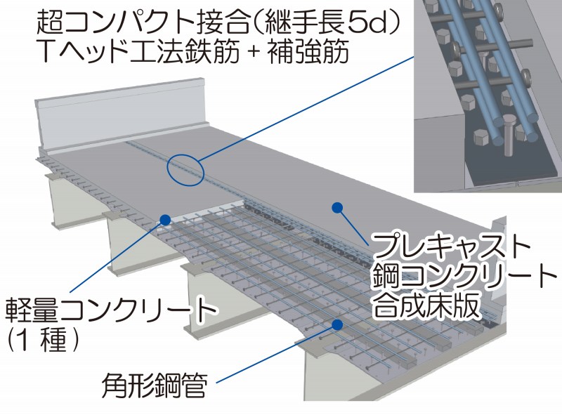 SLaT-FaB床版は、橋梁床版の取替工事用に軽量化と接合部のコンパクト化を図ったプレキャスト合成床版で以下の特長がある。・床版の薄肉化に加え、角型鋼管と軽量コンクリート(工種)を用いて軽量化。・橋軸方向の接合には、Tヘッド工法鉄筋を用いて接合部長さを短縮化 ・橋軸直角方向の接合も容易であり、分割施工にも対応可能。・接合部にはラテックス改質速硬コンクリートを用いて耐久性を向上。